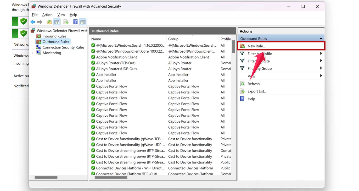 Open Start Menu. Search for Windows Defender Firewall with Advanced Security. Open it.