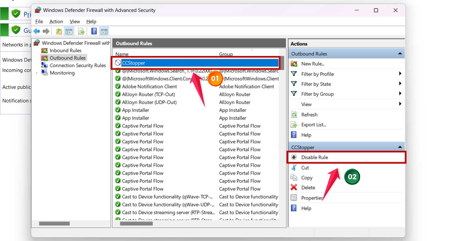 - Disable or remove any “CCStopper” rules or similar in both Inbound and Outbound rules.