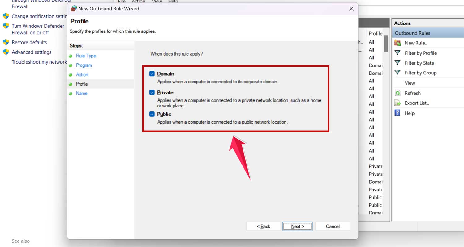On the left, click Outbound Rules. Now, on the right, click New Rule. Choose Program.